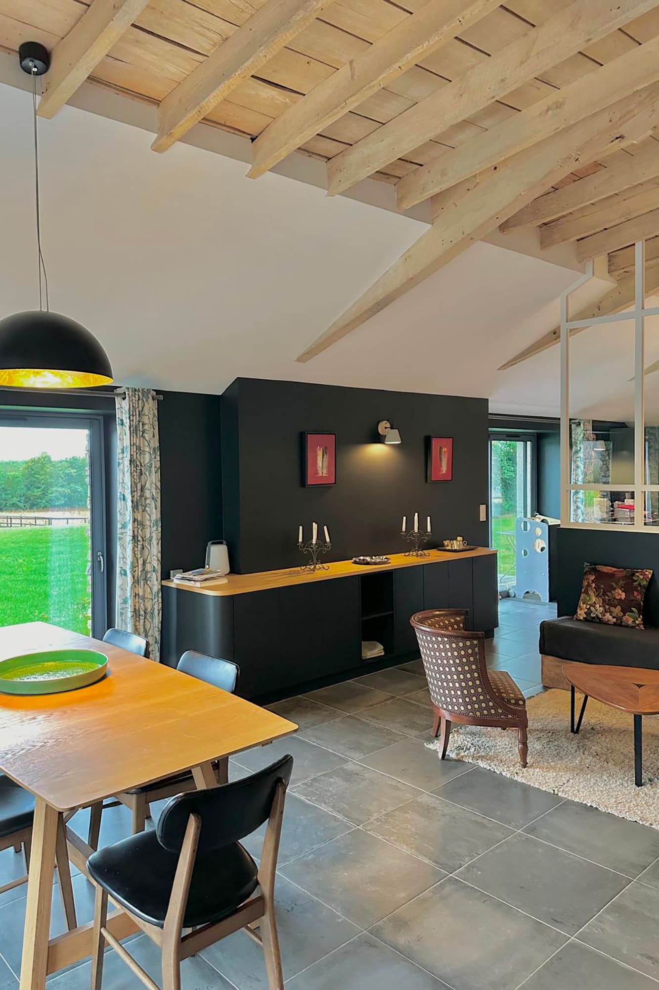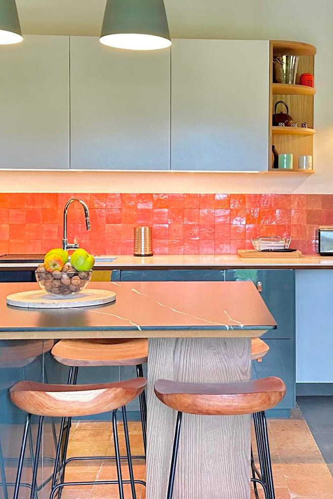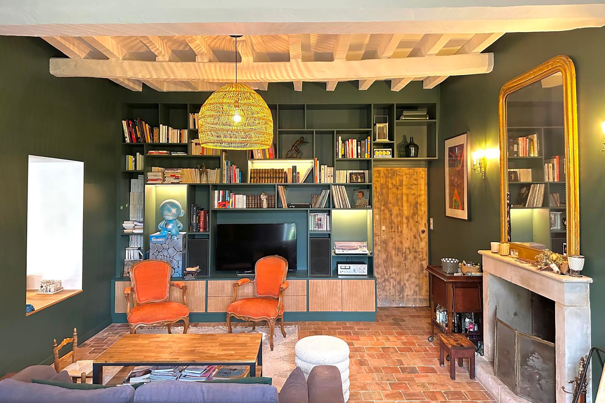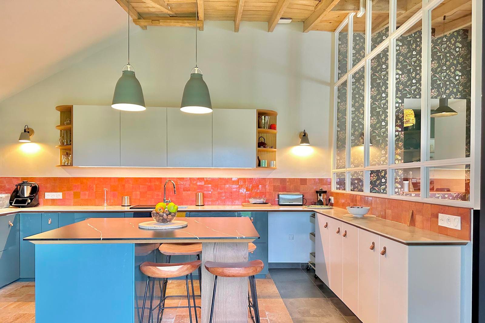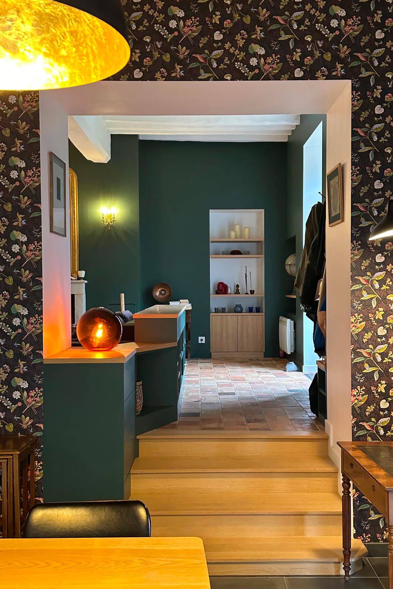 L’espace de vie se structure autour d’une cuisine chaleureuse, rythmée par des zelliges terracotta et un. mobilier sur mesure aux teintes bleu-gris. Une verrière graphique relie subtilement les pièces, laissant circuler la lumière tout en définissant les espaces. Dans le séjour, les murs verts profonds mettent en valeur les poutres blanchies et le mobilier ancien revisité.