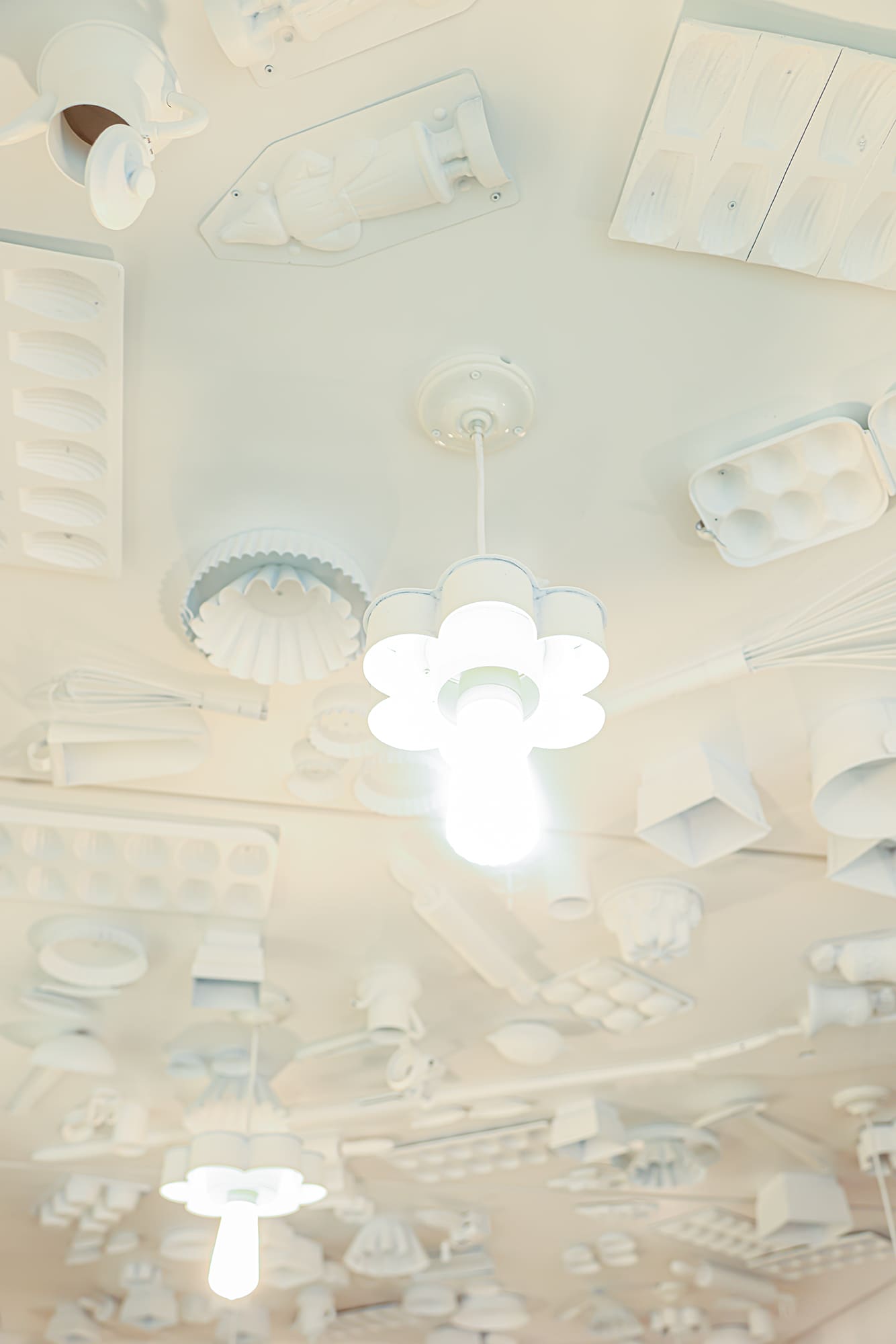 Élément central de la scénographie, le plafond de la pâtisserie Guillemard a été pensé comme une oeuvre d’art. Des Étoiles y a suspendu une constellation d’objets détournés : moules, fouets, emporte-pièces et ustensiles de cuisine, moulés en blanc et intégrés à une composition sculpturale.