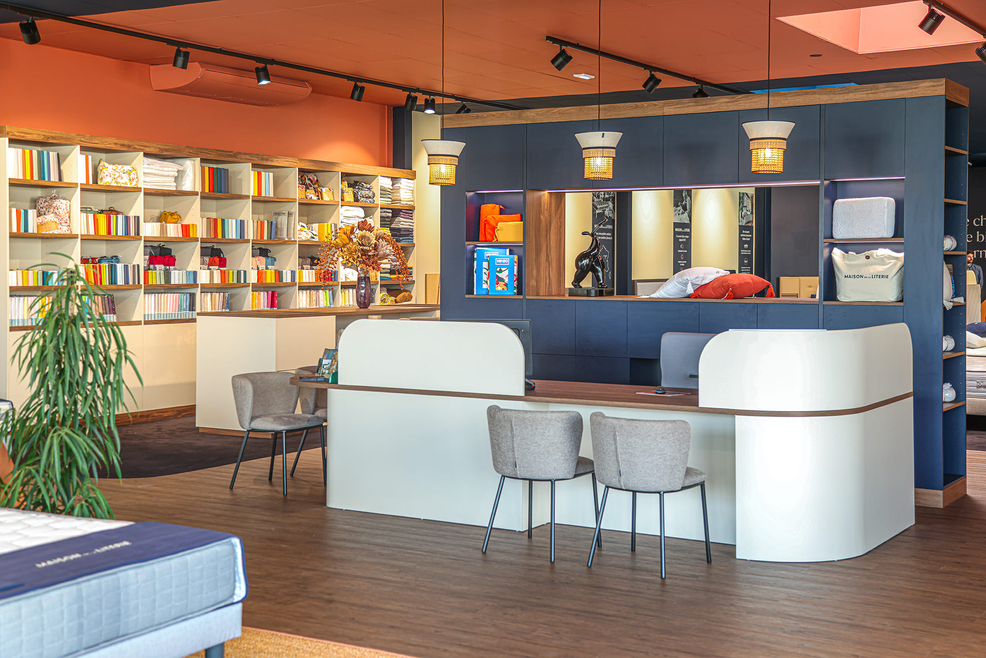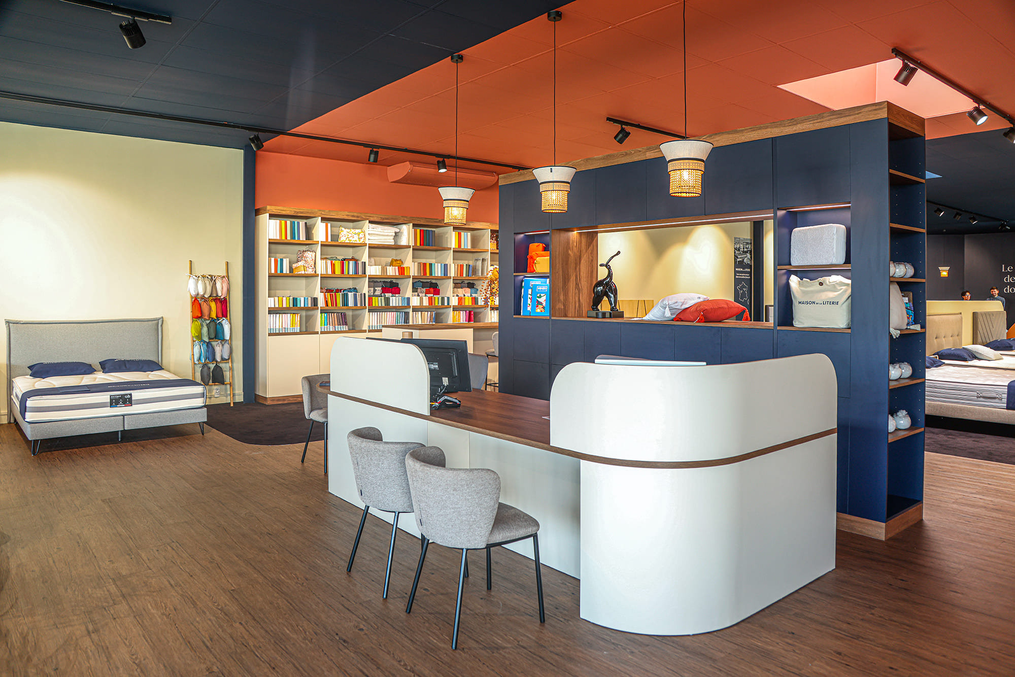 L’un des enjeux majeurs du projet était de réinventer la scénarisation du parcours client au sein de Maison de la Literie. Plutôt qu’un simple agencement, l’espace a été pensé comme une promenade sensorielle. Les zones d’exposition s’articulent autour d’une palette chaleureuse où dominent les tons terracotta et bleu profond, contrastés par des matières naturelles et des éléments en bois clair.