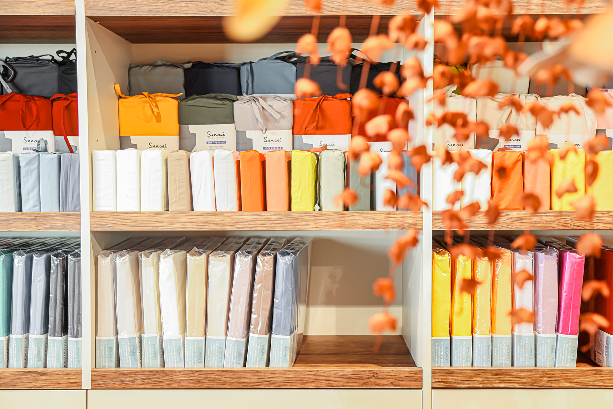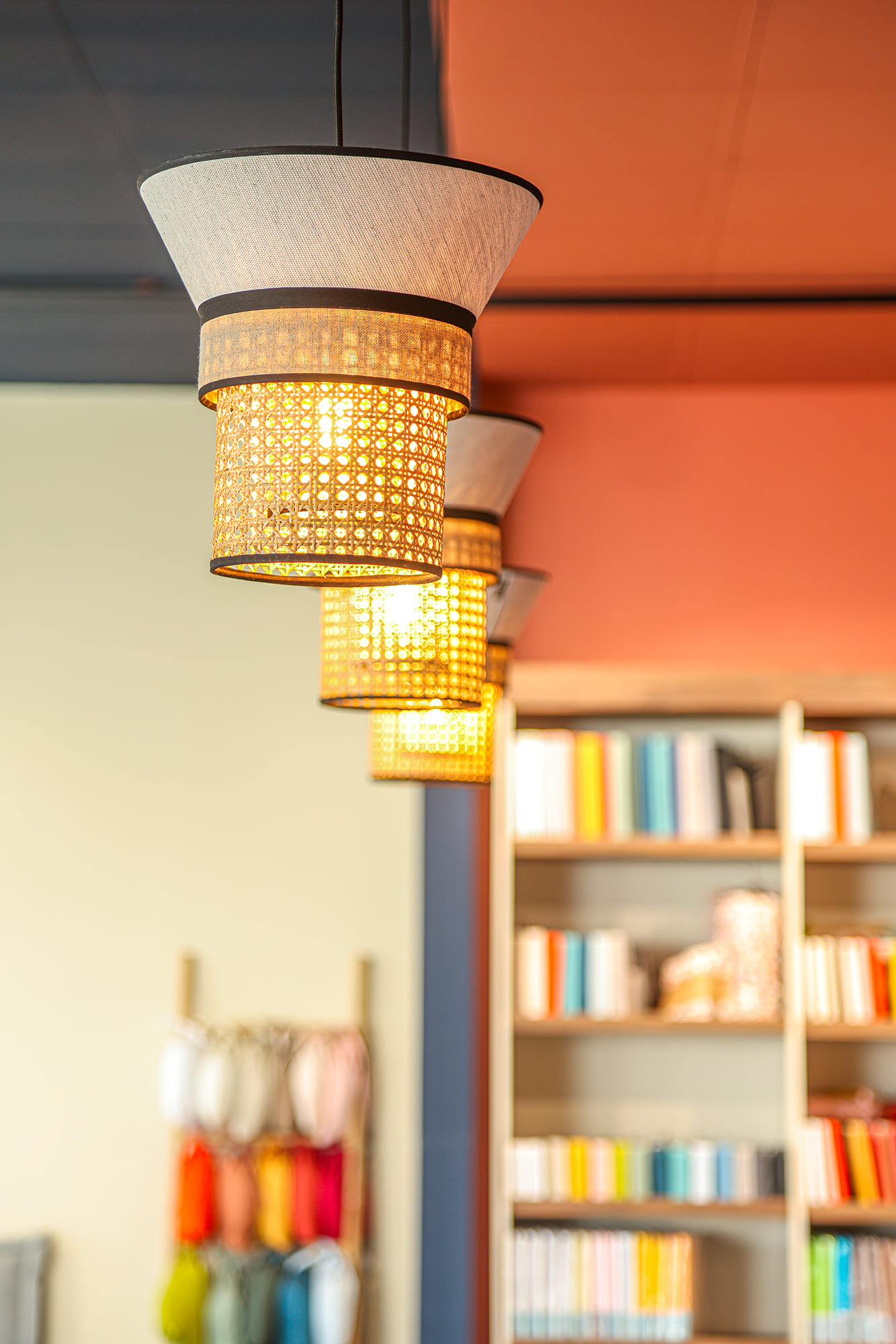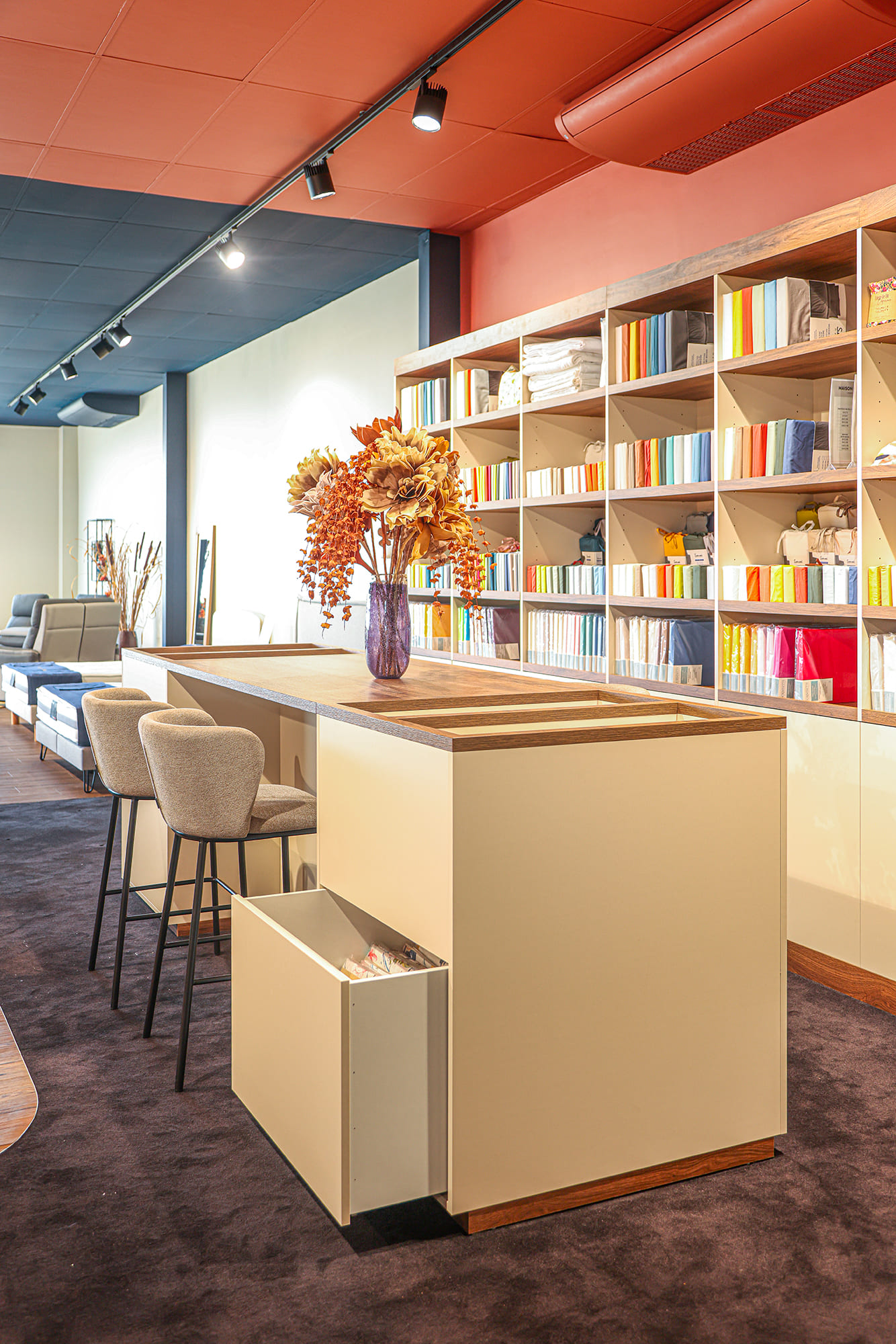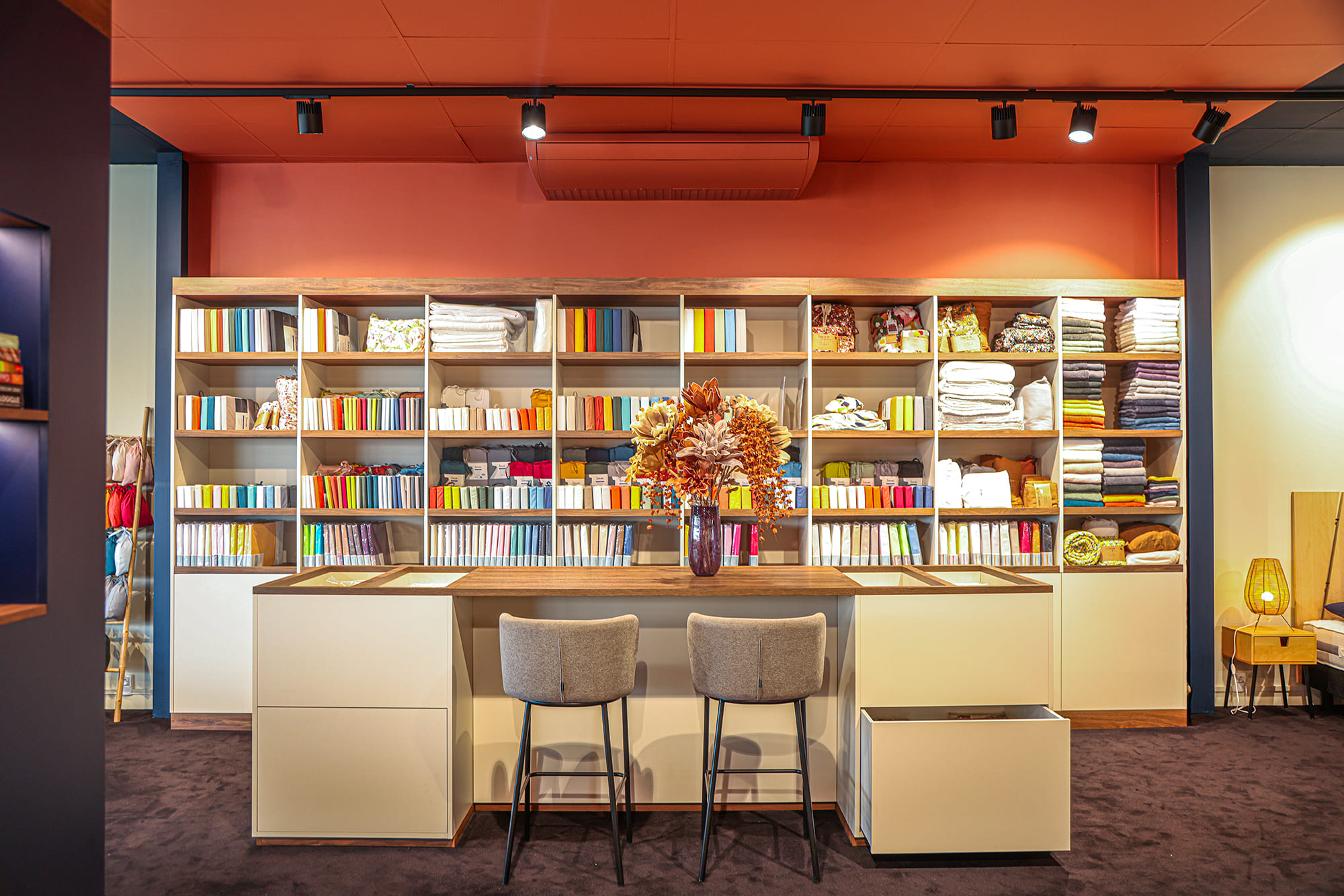 En arrière-plan, la bibliothèque se déploie sur toute la hauteur du mur comme un décor vivant. Ses niches colorées animent le volume et rythment la présentation des collections de linge et d’accessoires. La lumière naturelle, associée à un éclairage précis, révèle la richesse des matières et des couleurs. Cette mise en scène subtile traduit la volonté de l’agence Des Étoiles de concilier fonctionnalité et émotion, en transformant chaque espace de vente en lieu d’expérience.