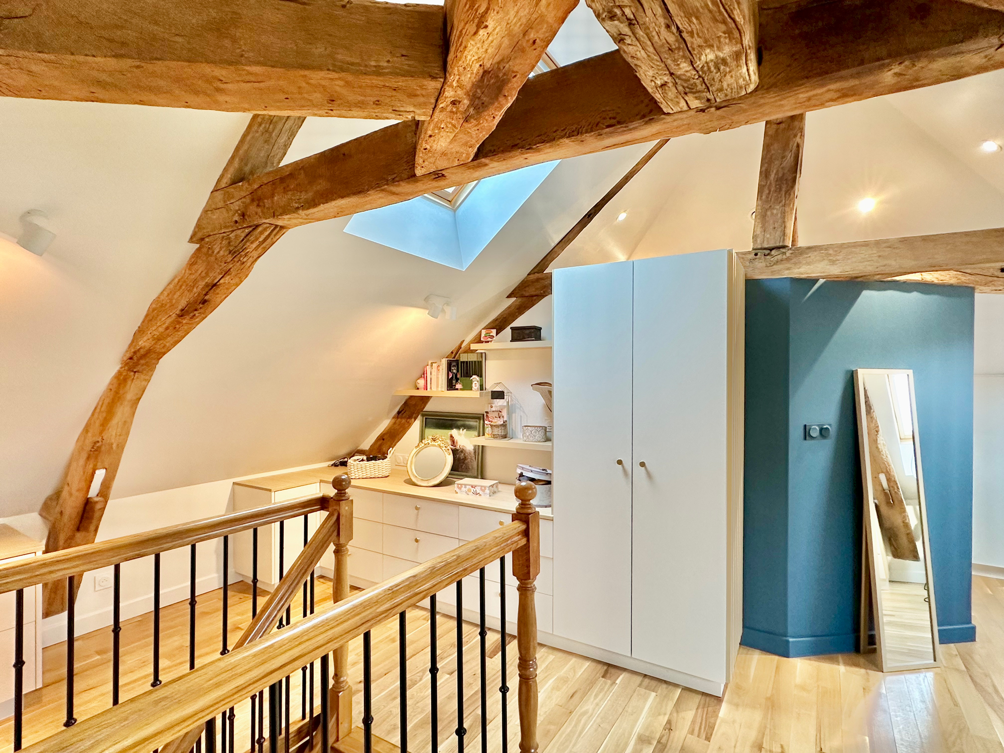 La faïence à connotation ancienne utilisée dans la salle de bain évoque le charme intemporel des demeures traditionnelles. Son motif délicat et ses teintes douces créent une atmosphère empreinte d’élégance et de nostalgie, en parfaite harmonie avec l’esthétique de la maison centenaire. Cette touche classique apporte une note de raffinement à l’espace tout en soulignant l’authenticité et le caractère unique de la suite parentale rénovée. L’ajout de tommettes au sol renforce son authenticité et témoigne de notre attachement au patrimoine local et aux techniques artisanales anciennes.